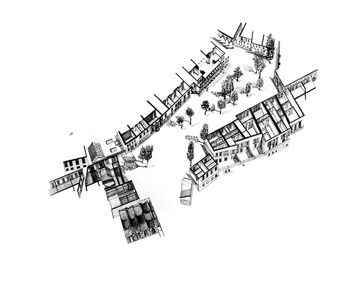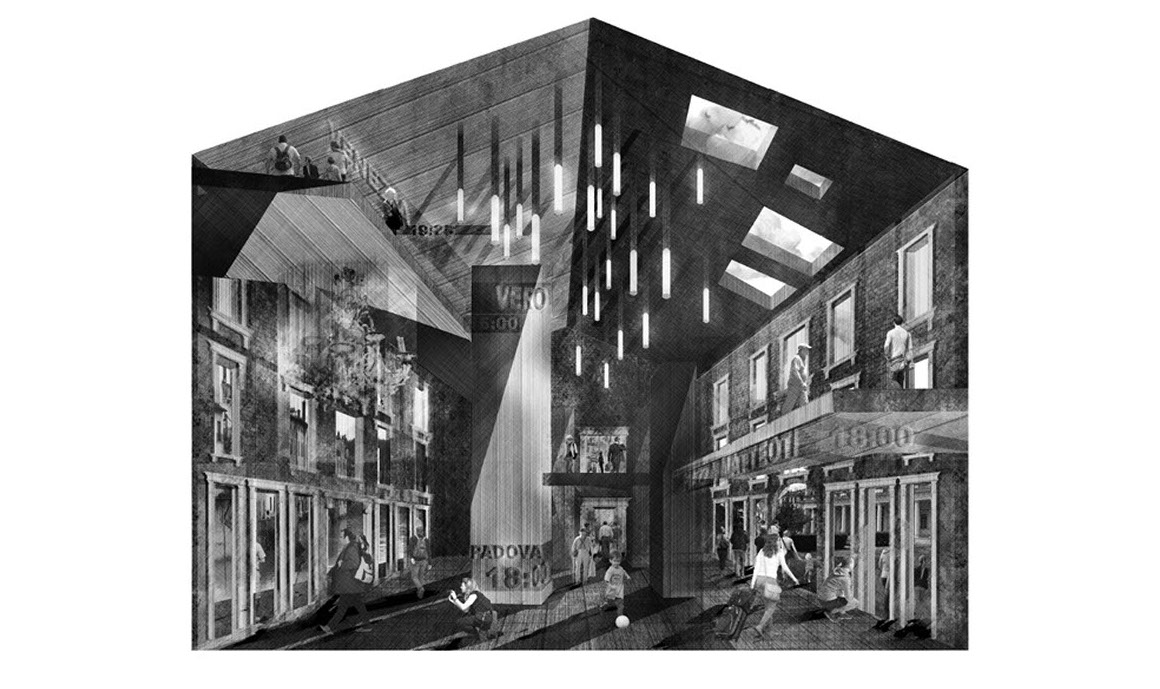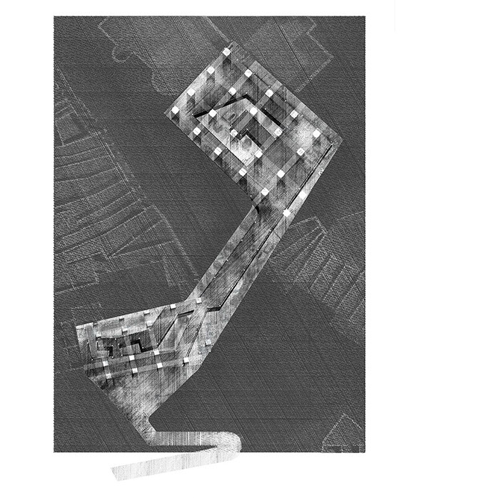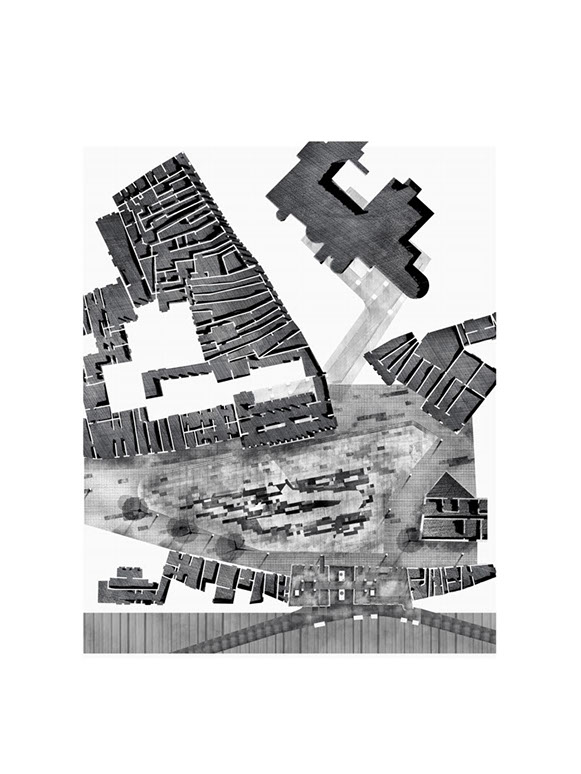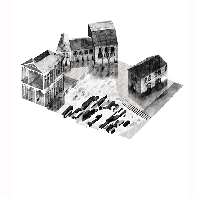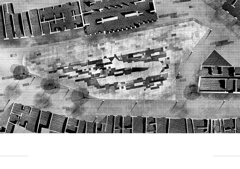 The Piazza interrogates the traditional perimeter arrangement of people around an open center, by challenging this with an inversion that places activity at the nucleus of the Piazza. Doing this through a staggering of miniature blocks, establishes a new typology of urban furniture allowing clear distinctions between trajectory traffic and leisure.