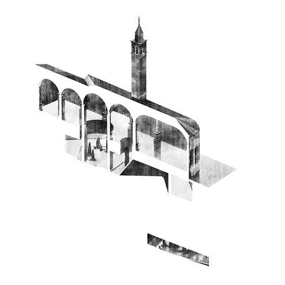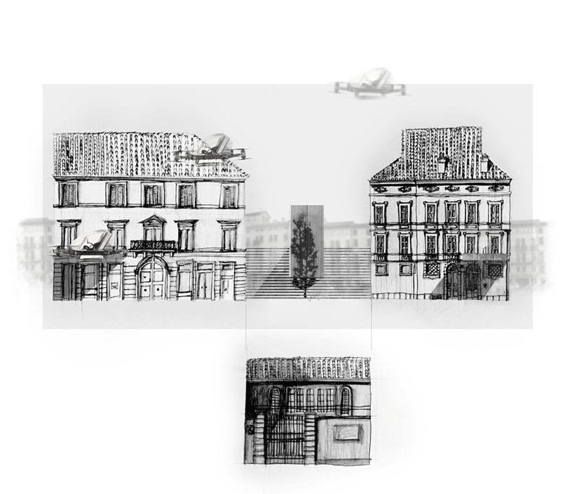 As historic time lines give depth to research within the site and town, it was relevant to envision future layers that parallel the slow, careful constructions of Vicenza. Imagining a transit system for one hundred years into the future, the curating of a drone transportation system allows for unobtrusive methods to arrive in the city center. If traffic is aerial, Piazza's can once again be gifted to pedestrians.