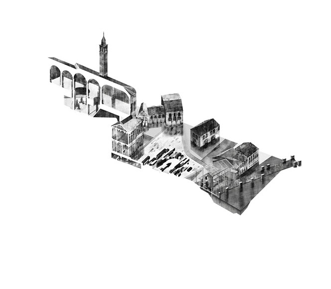 Hidden within these blocks, is another potential answer to the palimpsestuous nature of Italian development - ruin discovery during construction. Weaving a ramp between the Piazza's blocks from ground level to below grade, a path connects ruins found underground to ground level, celebrating the layered time line of Vicenza's former Roman self. The path serves as a ligature from the Cheoricati to the ruins beneath Santa Corona, all with the possibility of expanding this network upon excavating additional below ground relics.