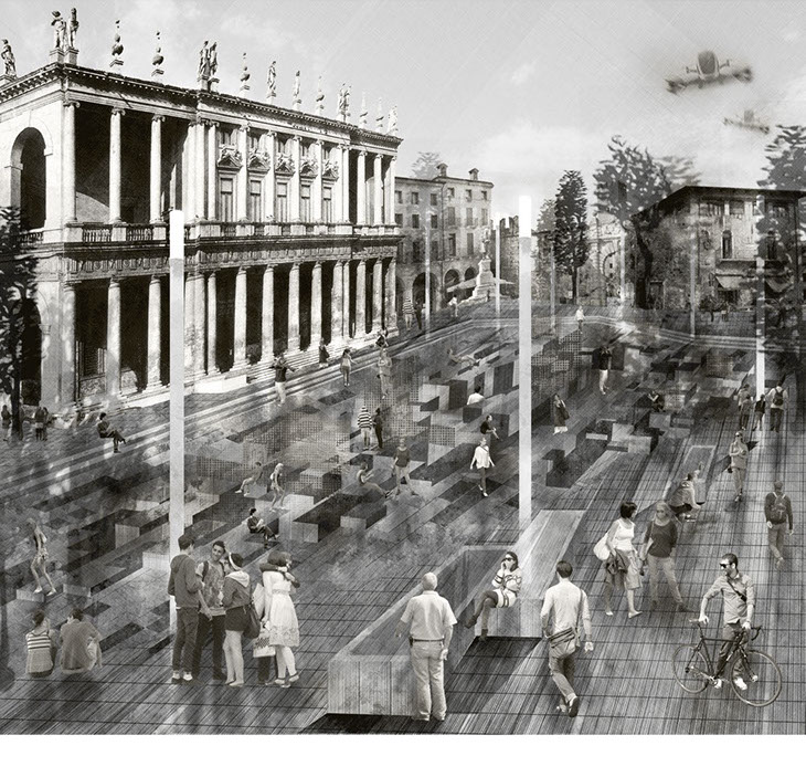 Vicenza, Italy - A Veneto epicenter once home to the Architect, Andrea Palladio, the town hosts numerous Palladian projects displaying his architectural pioneering of the mid 1500's. Palazzo Cheoricati, designed by Palladio, is one of the anchoring landmarks of the town, displaying valuable art and iconographies of Vicenza's rich Venetian influences. Uniquely, the Palazzo sits atop Roman Ruins, remnants that can be visited today through public cellar access in the building. In front of this layered artifact, is the Piazza Matteoti, which has become, respectfully, a neglected Piazza victimized by a growing parking lot to it's southwest corner.