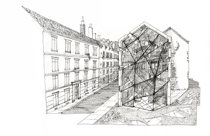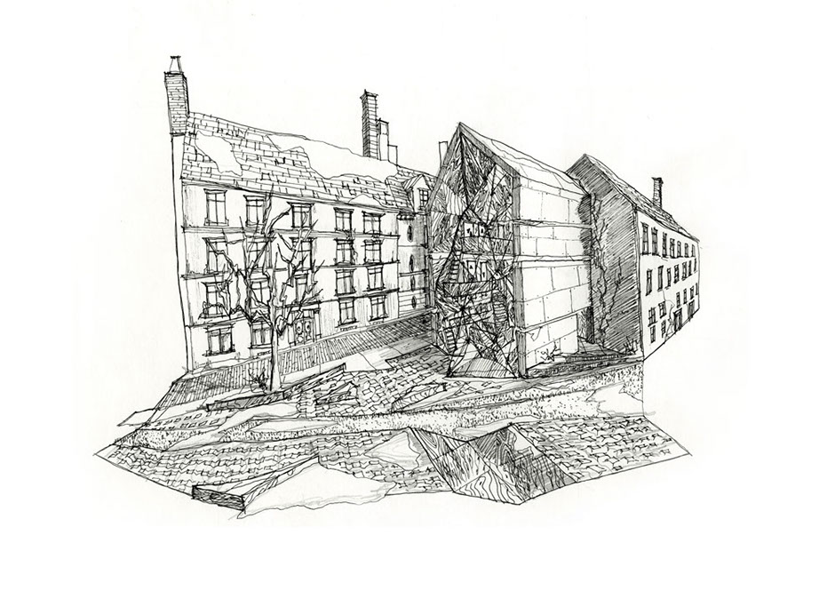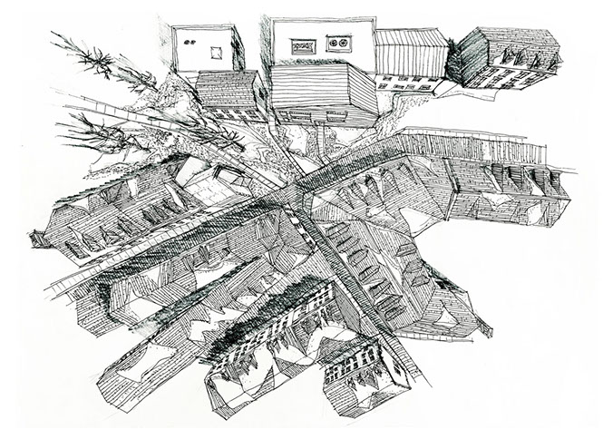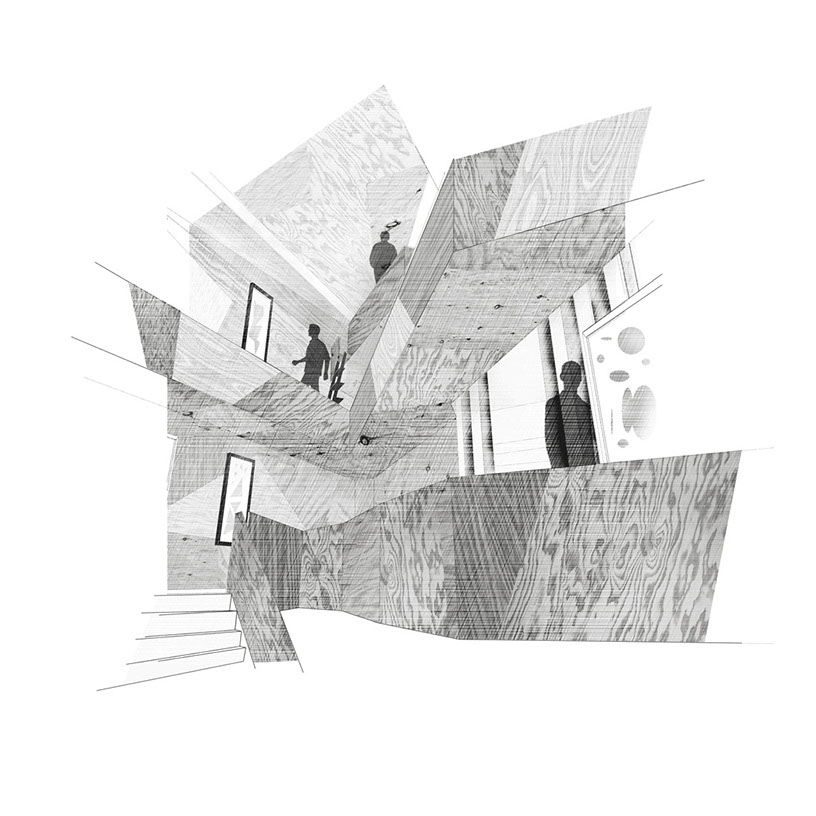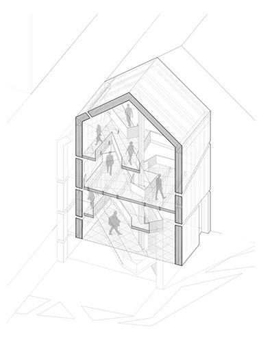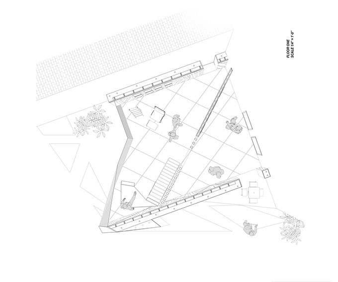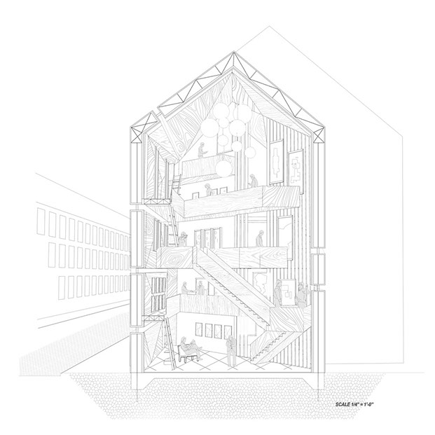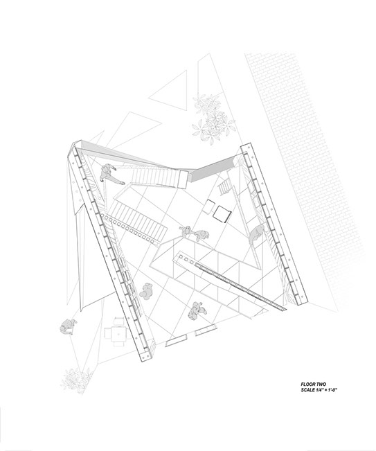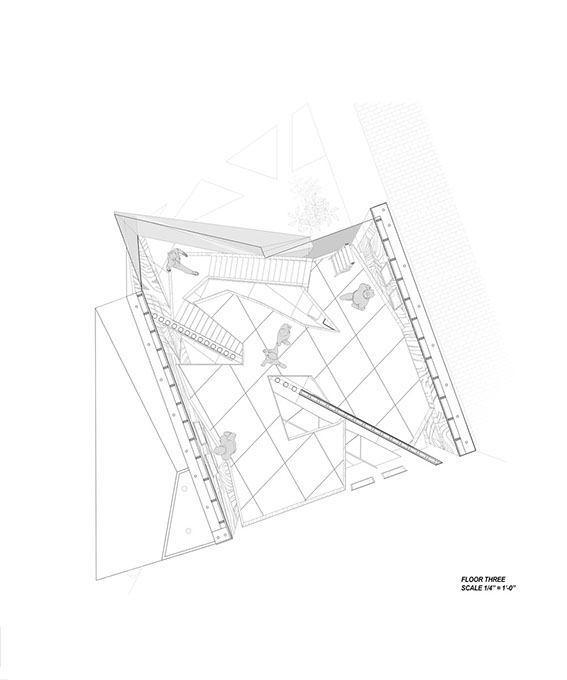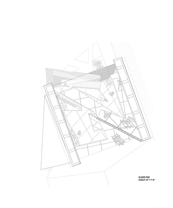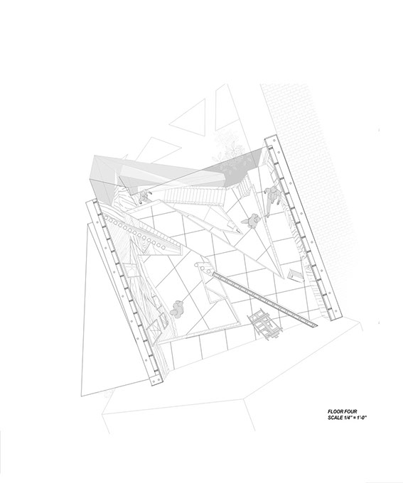 a fictitious citizen facing these changes, this body of work examines the parameters of a small, 25’ - 0” x 25’ - 0” plot of land abutting a park to the East. As this character is a painter, the project interrogates vertical occupation and art storage optimization through the development of interstitial levels that offer split experiences for guests and artist. The mindful stacking of interlocking floors deliver spaces for the artist to paint on even numbered floors, while odd numbered plates serve a public audience. These paths guide the two polarizing occupations past, above and behind each other; voyeuristic moments to see over the shoulder of the artist.