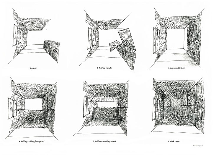 As users ascend and descend exhibitions and displays in the container, the artist apprehends the maximization of vertical space. Designing surfaces that fold to transform railing to wall, floor to railing, etc. in order to deliver more hanging space or dark rooms for documentation, secretive spatial interactions cultivate the volume. Being sensible about the placement of these functions was strategic as the entire facade of glass on the park side could alter daytime lapses in the gallery.