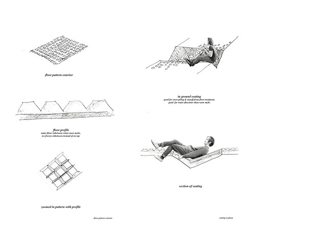 Providing the glass however, serves as a link between a new plaza, the art and the public path, users are drawn in by the layered elevations of art and commingled spectacle of observer and artist. The plaza extrudes elements of the internal circulation, to the exterior as a public component that shifts axes. Moments of pause and reflection in the form of seating are carved into the ground, changing viewer orientation from vertical art viewing to angled sky gazing.