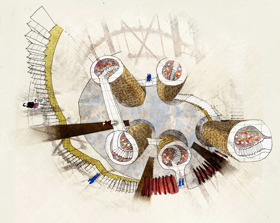 This precise programming translates to the description of the past through the architecture of the internal capsules. Contextual materials such as Venetian plaster, coat floating capsules that are offset from the perimeter of the gasometer. The surrounding ramps are paced with reused bricks from old structures in the region. Light fabrics at the top of the archive serve as protective screens for the harmonizing and cultivation of these filters.