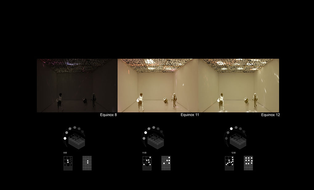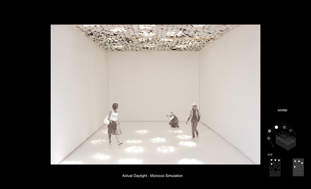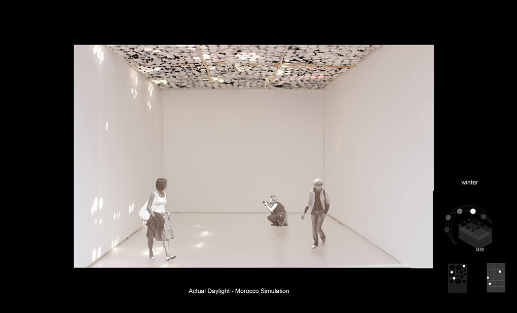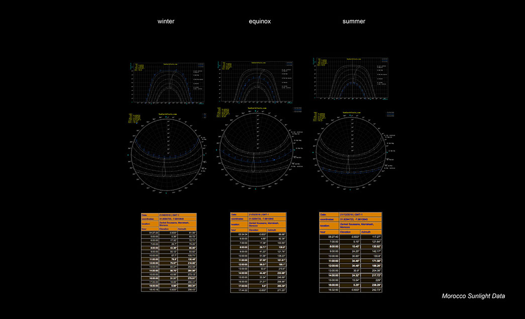 Using coordinates and data from Marrakesh, Morocco, sunlight elevation and azimuths were placed in a studio made sun simulator. These coordinates were marked on the simulator for the Summer, Equinox & Winter. Placing a fake sun at these coordinates and falsely running the course of a day, models were positioned in the center of the device in order to test the natural lighting designs against the data. This allowed for positive alterations of lighting and based around factual experiment.