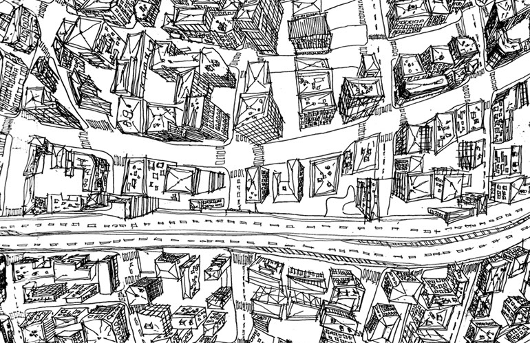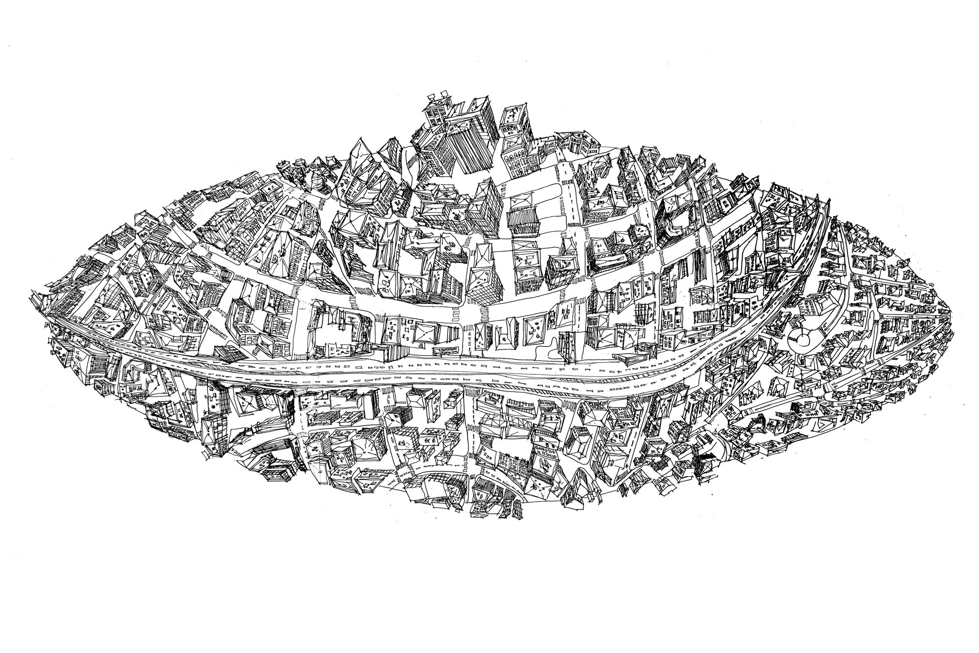 An exercise in perspective of an imagined city, split by highway. What are the effects of modern, poor infrastructure only alleviated by highway?